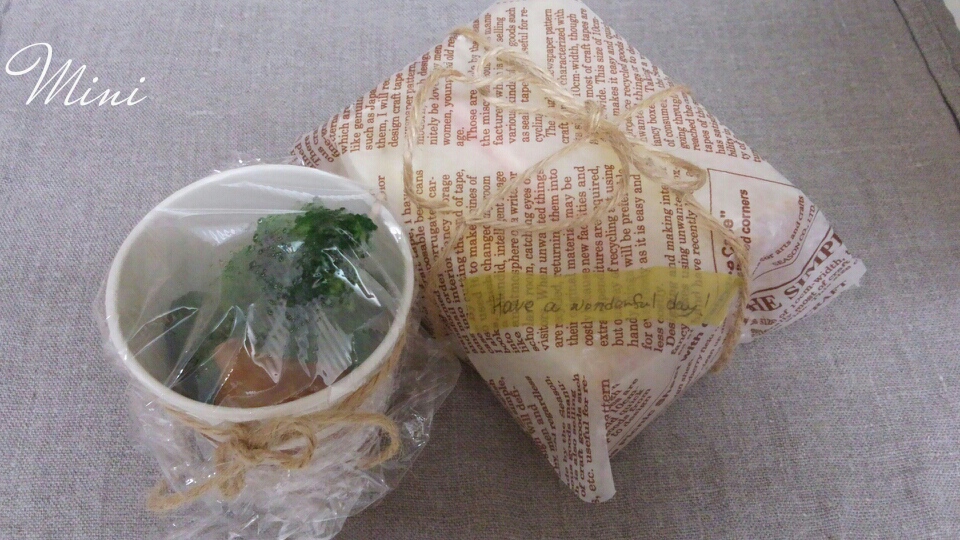 おかずは楊枝で刺して紙コップに入れてラップ+麻紐。