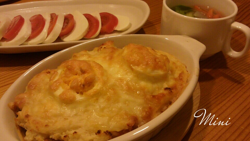 更に、ホワイトソース作るのも面倒だったので…COSTCOのマッシュポテトを緩めに溶かしてホワイトソース代わり。