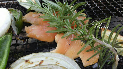 それに、今回はクレージーソルトを振りかけておいて、焼くときには庭のローズマリーを一緒に焼いてみたよ!