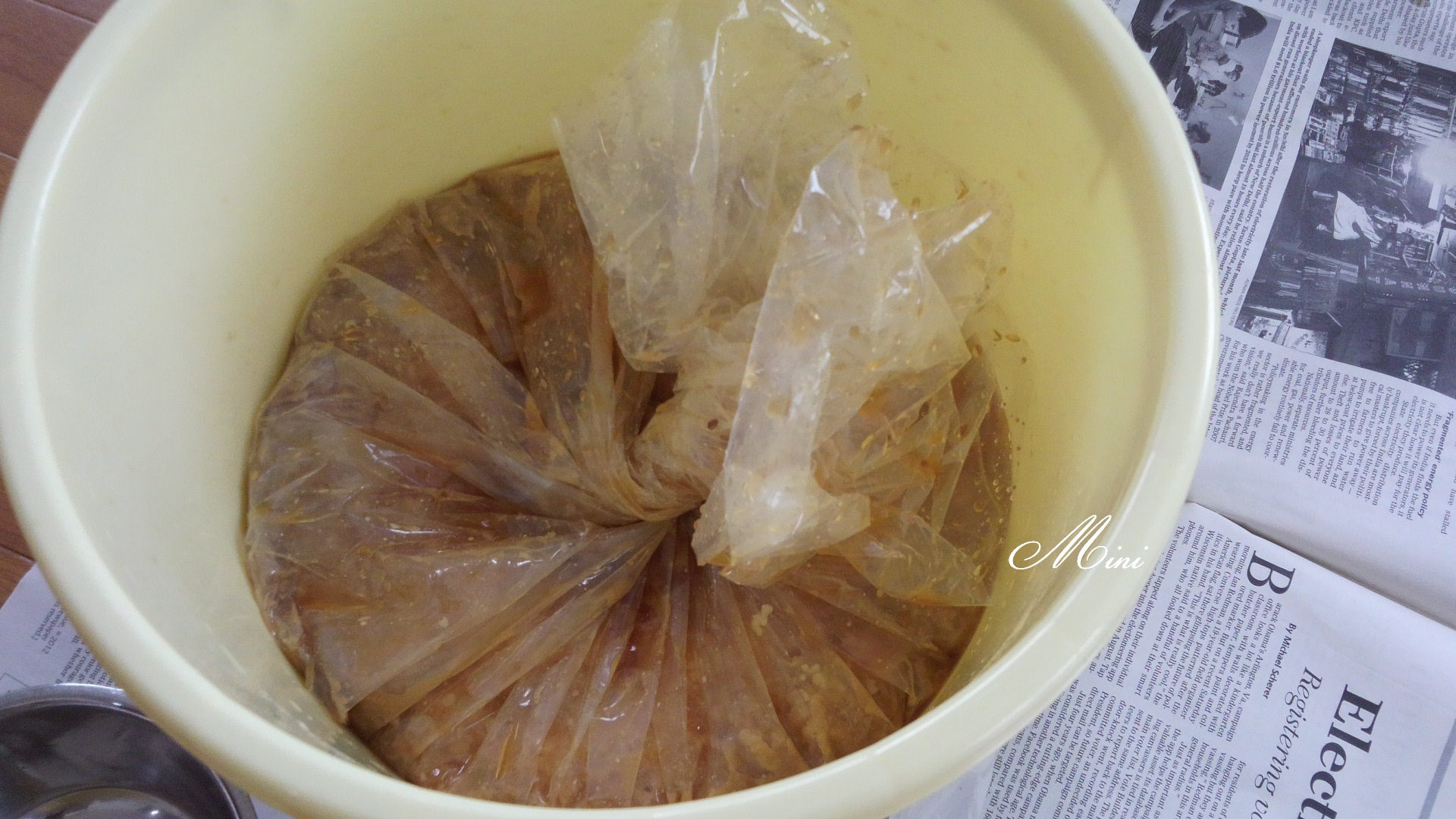 天地返しをして、ホワイトリカーを染み込ませたキッチンペーパーで袋や樽を拭きあげて、元の姿に戻しました。